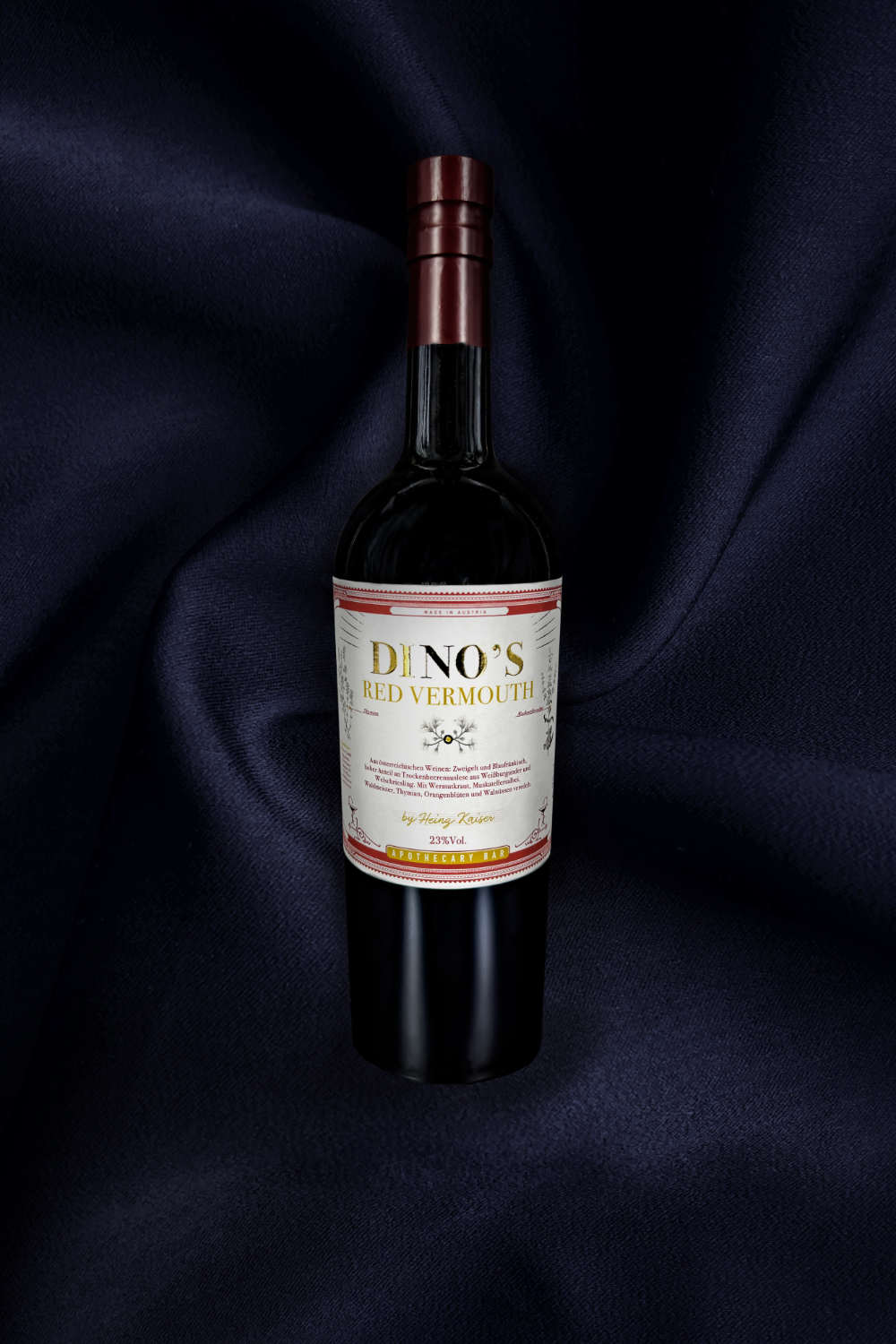 DINO’S Red Vermouth aus österreichischen Rotweinen der Rebsorten Zweigelt und Blaufränkisch, abgerundet mit weißer Trockenbeerenauslese aus Weißburgunder und Welschriesling.